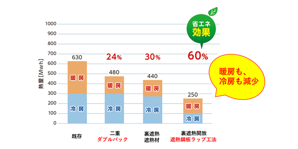して室内への輻射熱を阻止します。しかしながら、建物の省エネ効果は概ね30%