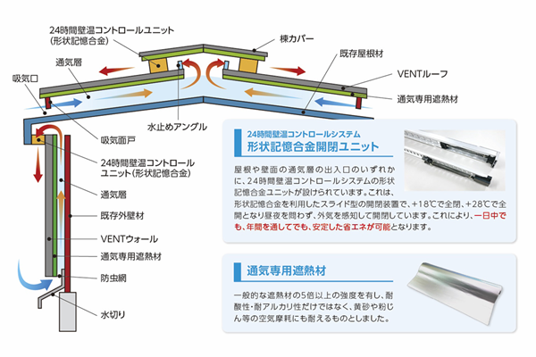 使用するのは、空気。通気専用遮熱材、形状記憶合金Uで、 稼働ネルギーは全く