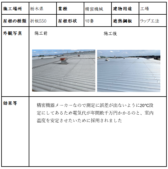 年間を通して室内を20℃に保温している宇都宮の精密機械工場、遮熱鋼板ラップ